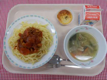 主食は、「スパゲティシーフードトマトソース」です。トマトソースの中に、ベーコンや玉ねぎ、ほたて、いか、あさりなどの具がたっぷり入っています。シーフードのうまみの出ているソースになっているので、よく味わって食べてください。