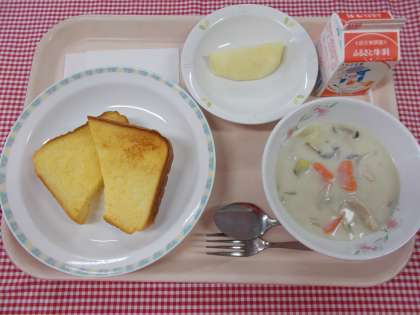 今日の主食は、「フレンチトースト」です。もともとフレンチトーストは、固くなったパンをおいしく食べるために生まれた料理です。卵・牛乳・砂糖をよく混ぜた液に、パンを浸して焼きます。ふんわりとした食感がおいしいです。