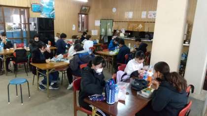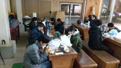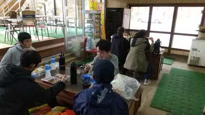 コースを変更して、紅葉台ドライブインで昼食を食べています。1階と2階で分散しています。1階の様子です。(田村)
