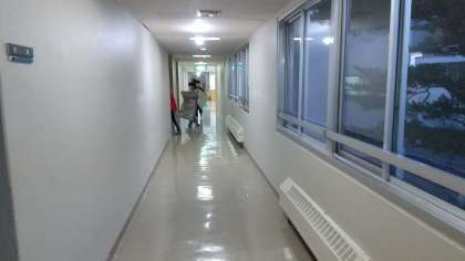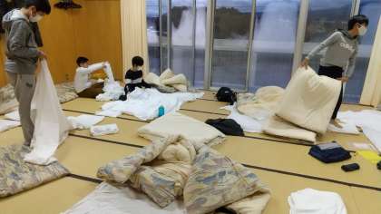 移動教室2日目が始まりました。布団をたたみ、生徒たちもきびきび行動しています。(田村)
