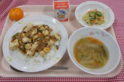主食は、「麻婆豆腐丼」です。麻婆豆腐は中国の四川料理の1つで、ひき肉と豆板醤などを炒め、鶏がらスープと一緒に豆腐を煮た料理です。ピリッとした辛さが食欲を刺激します。