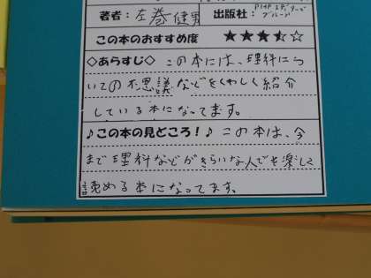 昨日の学校日誌に紹介された出張図書です。ふだん図書室になかなか足を運ばないフナキボ生にもぜひ本の魅力を味わってもらおうと司書さんが企画をしています。なるほど…これなら理科が苦手な人にも手に取ってもらえるかもしれませんね。
