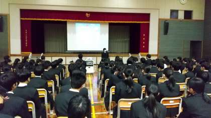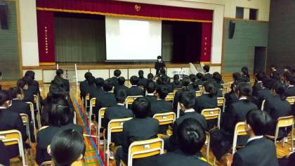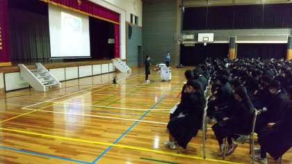 本日、3時間目に1年生のビブリオバトル、学年代表決定戦が行われました。各クラスの代表が出揃い、体育館で発表をしています。それぞれの発表者は緊張しながらも工夫して発表しています。(田村)