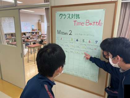下校するとき、廊下で5組のタイムを確認するする姿がありました。二日連続の3位!良い位置をキープしてます!