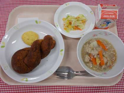 今日の給食は、リクエスト第二位の「揚げパン」が主食の献立です。デザートもリクエスト第二位のクッキーを出しました。味わって食べてください。
