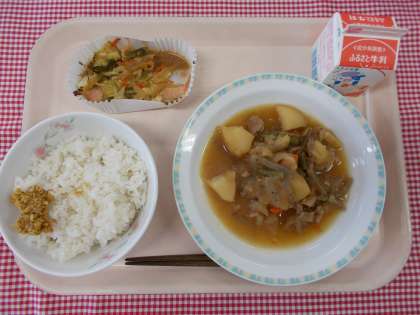 主菜は、「鮭のちゃんちゃん焼き」です。「鮭のちゃんちゃん焼き」は、北海道の郷土料理です。名前の由来は諸説ありますが、大きな鉄板で具材をチャンチャンと混ぜながら焼いてつくることからついたそうです。給食では、大きな釜で炒めた具材を鮭にのせて焼きました。
