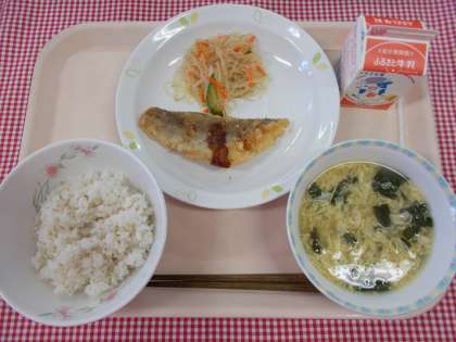 今日の給食は、「たらのピリっとジャン」です。たらに酒としょうがで下味をつけ、衣をつけて油で揚げました。ピリっとする豆板醤が入ったタレを上からかけています。豆板醤だけでなく、パインアップルやにんにく、しょうがなどいろいろなものが入っています。今日もよく味わって残さず食べましょう。