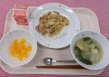 主食は、「回鍋肉丼]です。回鍋肉は、一度炒めた食材をとり出し、また鍋に戻して調理するという意味だそうです。給食でも、キャベツの食感が残るように工夫して調理しています。