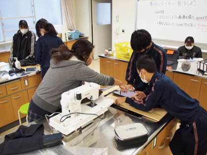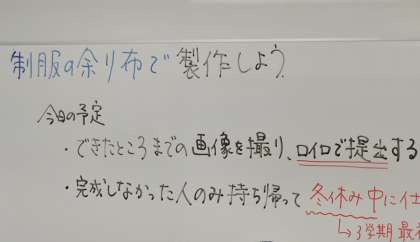 11期生の家庭科です。制服の余り布を使って作品を製作しています。余り布が部屋の後ろに重ねて置いてありました。聞いてみたところ、学生服を作る会社から提供してもらったとのこと。なるほど〜。これは有効なリサイクルですね。