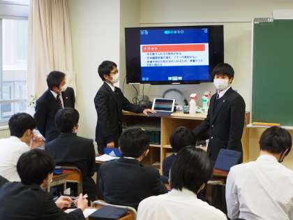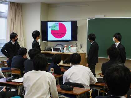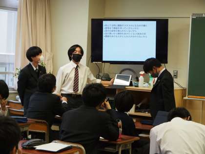 10期生の保健の授業は、臓器提供についてグル−プで話合い、賛成と反対それぞれ根拠を示して発表する授業です。こういう授業で、タブレットを使い発表資料を作るのはどのグループも手慣れたものです。