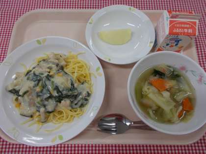主食は、「ほうれん草のクリームスパゲッティ」です。ベーコンや鶏肉、ほうれん草などを炒め合わせ、ホワイトソースと絡めてチーズや生クリームを加えて仕上げました。冬にぴったりのスパゲッティです。味わって食べてください。