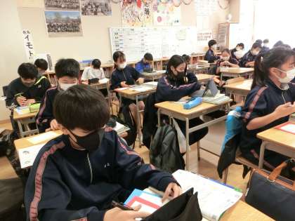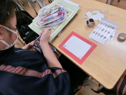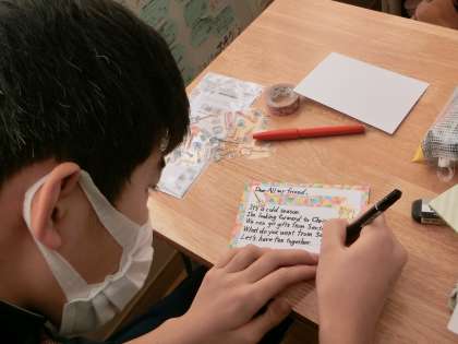 グリーティングカードを書くという課題に取り組んでいます! クリスマスカードや、Thank you カード、誕生日カードなどの内容で、送る相手も友だち・家族・先生などさまざまです。とても楽しそうに、でも真剣に取り組んでいます。(水巻)