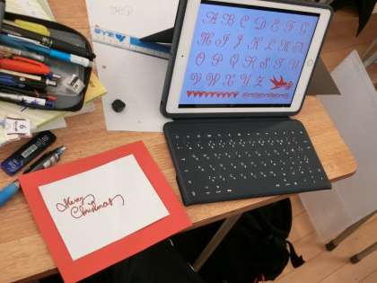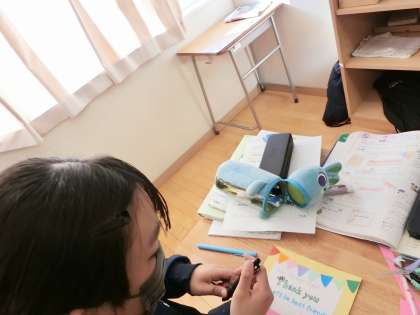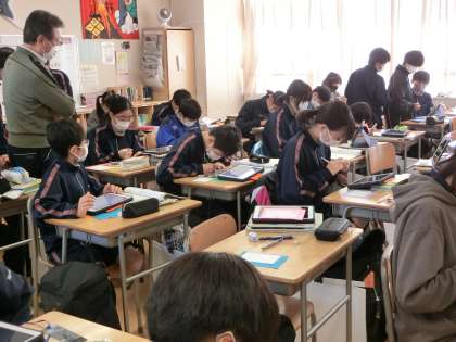 グリーティングカード作成中です。1組には筆記体を調べてチャレンジしている人もいました。「主体的」な態度で取り組んでいますね! 飾り付けもいろいろと工夫していて、仕上がりが楽しみです(水巻)