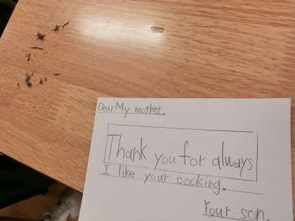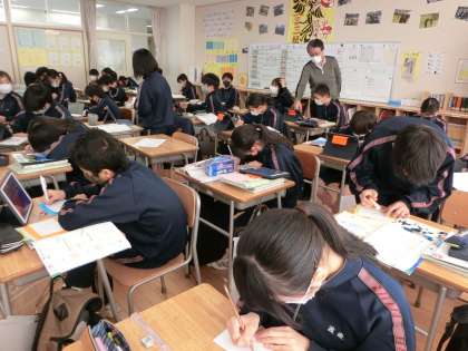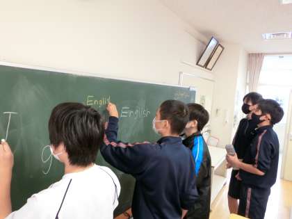 グリーティングカード作成中です。お母さんあてに、Thank you カードを作成している人もいました。それぞれの人に気持ちを込めて作成している様子があり、とても和やかな雰囲気です。3枚目の写真は、授業前の休み時間、利き腕とは反対で文字を書いたらどうなる?と楽しんでいる男子たちの様子です。(笑)