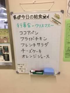 2学期最後の給食メニューはクリスマスメニューです。毎日の美味しい給食も、二学期最後です。ココアパンが届いています。残念ながら今日は揚げパンではありません。食べ残しゼロを目指します!昨日の職員室では、毎日美味しい給食をありがとうございます!と、栄養士の高橋さんに感謝を述べていました。(大橋)