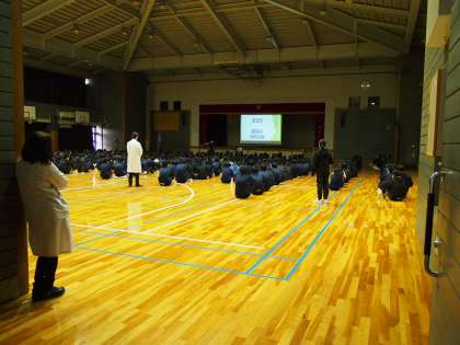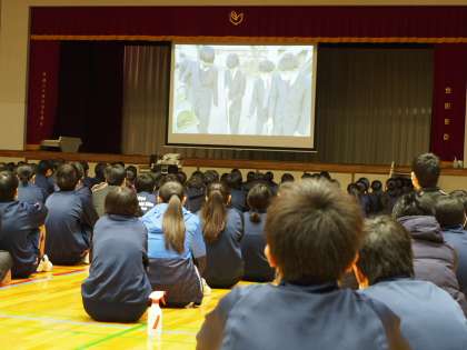 さすが3年生。学級委員会が司会、進行を担当しています。受験の冬を乗りきるための10ヶ条や2学期を振り返る映像など盛りだくさん。でも、聞く姿勢はやっぱりいつものフナキボ生でした。