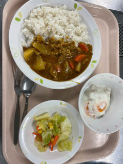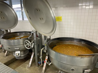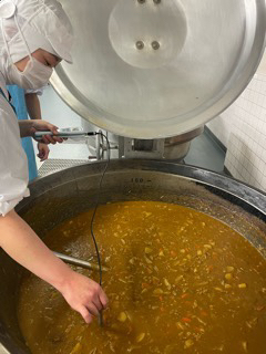 今日の給食、出来上がりました!鶏がらスープと手作りルゥ、飴色玉ねぎ、いろいろな野菜、そして大蔵大根。調味料を入れると、カレーだけで25種類もの材料を使っています。今日は800人分を2釜で作りました。2枚目の写真は、温度を確認しているところです。3枚目の写真に、牛乳がのります。美味しく食べられますように。(高橋)