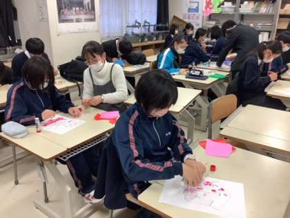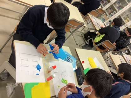 スローガン作成が始まりました。今回はサブタイトルをちぎり絵で表現します。地味な作業でもみんな黙々と丁寧にちぎって貼って、を繰り返していました。完成が楽しみです。(岩崎)