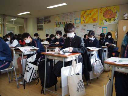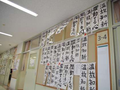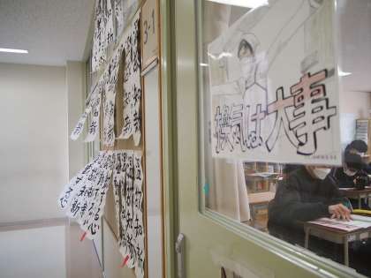 今週は今日がNIEタイムです。新聞を広げながらもちょっと寒い(?)それもそのはず。感染症対策を徹底するため、換気をつねに欠かさないフナキボは教室も廊下もすべて窓をオープンにしています。廊下に貼ってある書き初めの半紙は常にヒラヒラ。