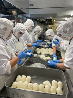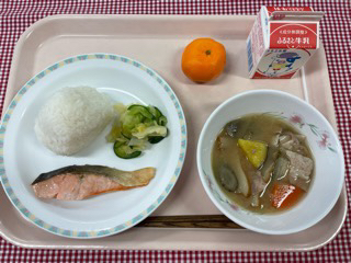 給食が初めて提供されたとされる、明治22年の給食、「おにぎり、焼き魚、漬物」を再現しました。今日は栄養価を満たすため、汁物など他にもいろいろついています。