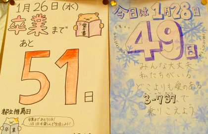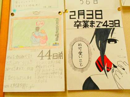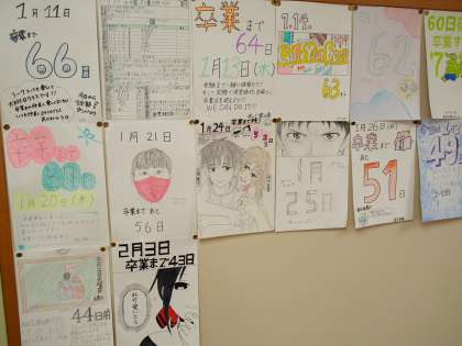 これも10期生の教室に掲示してありました。この時期から「卒業まであと○○日」というカウントダウンが見られるのが恒例です。このクラスはそれを順番に貼っているようです。