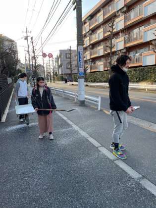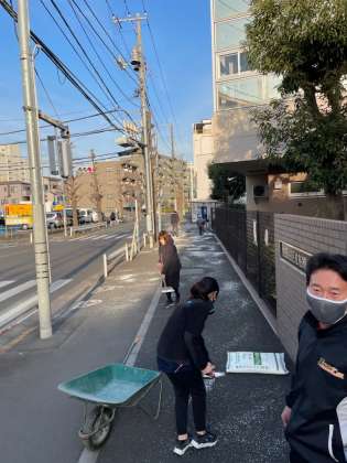 明日の雪に備えて、教員達で塩化カルシウムを撒きました。