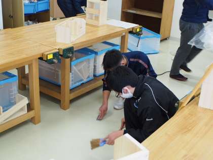 フナキボの技術木工室は床がぴかぴかしています。それもそのはず。こうやって、床の汚れを丁寧に落とす作業を生徒がしているからなのですね。このひと手間が大切。