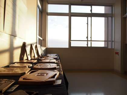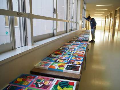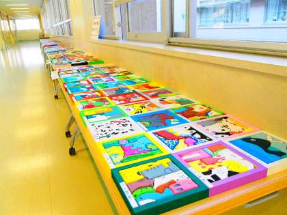 いつもの朝と少し違うのは、廊下に展示発表の生徒作品が並べられ、朝陽に照らされて輝いていることです。窓を開けている先生も、思わず手を止め見つめてしまう作品の数々です。保護者や地域の方に見ていただけないのはとても残念です!