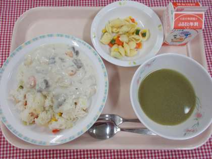 今日の給食では、お話に出てくる「ジュテームスープ」をアレンジして出しました。食べると願いが叶う魔法のスープです。スープを飲んだ二人が両想いになったことから、「恋が実る料理」として有名になったそう。楽しんで食べてください。みなさんの願いが叶いますように。