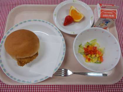 今日の給食は、3年生応援メニュー「カツサンド」です。