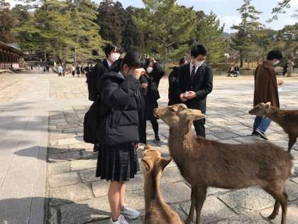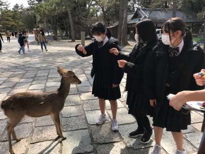 鹿せんべいを買ったグループが鹿に追いかけられるこの画像は修学旅行の風物詩となりました。鹿さんは昔から変わっていませんね。