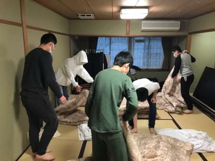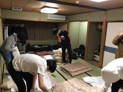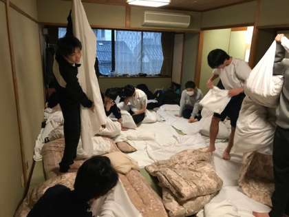 元気な良い起床放送!のおかげで既に数分後には片付けを開始していました。放送の評判を聞くと「最高でした…」「先生たちのようにテンションが高くないです」中には無言(?)のところも。修学旅行最後の朝ですから元気よくいきましょう!