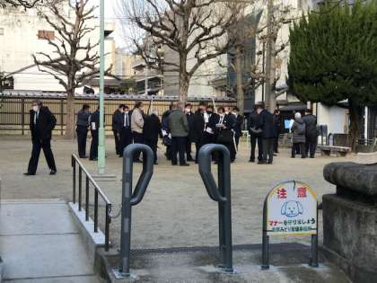 貴重品を戻してタクシー行動の準備です。ちょうどその頃旅館の前の母園ではタクシー運転手さんたちが集まってミーティングをしていました。