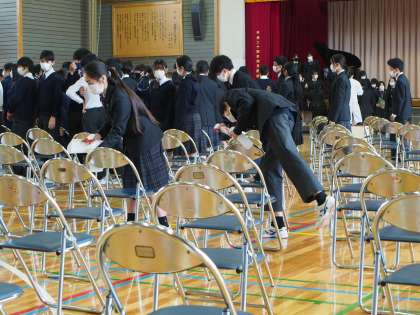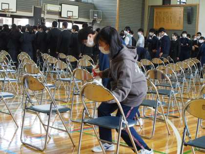 3年生がリハーサルで体育館に入ってくる前に、係の生徒が椅子の消毒作業をしていました。なれた手つき、テキパキとした行動。これもフナキボらしさと言えるでしょう。
