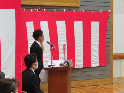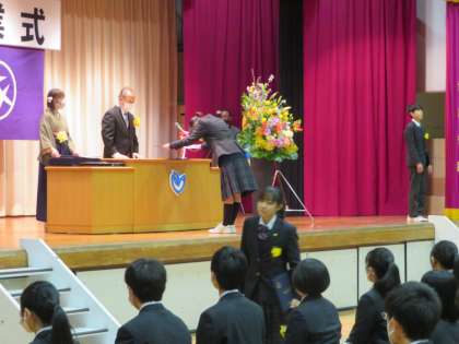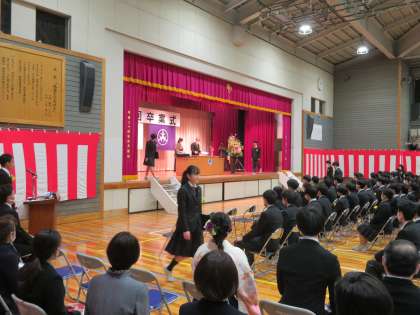 証書授与が始まりました。校長先生、学年主任の小牧先生から一人一人証書が授与されます。1組の証書授与の様子です。(田村)