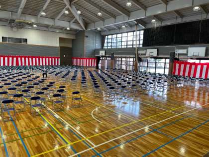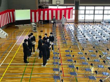 3-1の生徒と学級委員、生徒会役員が中心に入学式の会場準備をしました。整然と並ぶ椅子から頑張りが伝わります!