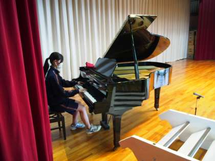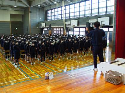 学年主任の先生から急遽「校歌で締めくくろう」との提案が。そんな無茶振りにも、11期生の指揮者と伴奏者は慌てず「楽譜がないので間違えたらごめんなさい」と言いつつ、見事にやってくれました!えらいなあ。こういうところがフナキボ生のよさです。
