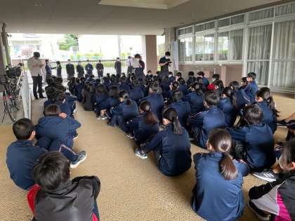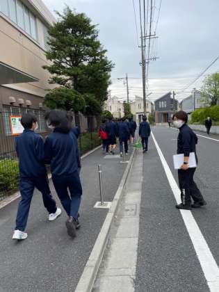 先週の二日間は雨のために校内清掃を行いましたが、今日は晴れているので、学校の周りや近くの神社・公園に別れて、桜の花びらの清掃を行います。