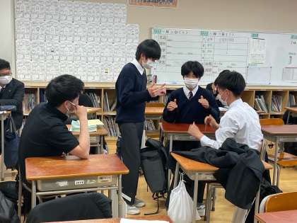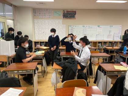 担任の先生とゲームで大盛り上がりの男子生徒たちがいました。楽しそう!