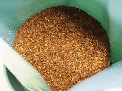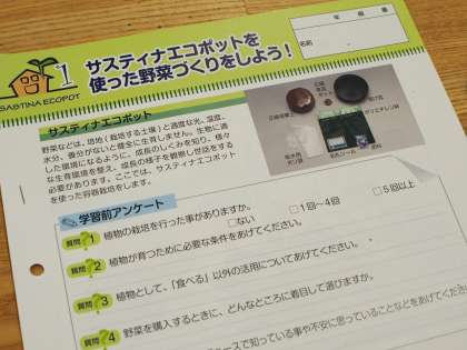 サスティナエコポットをつくるための説明を真剣に聞いています。。水を入れ、かき混ぜてまた水を入れ、あとはふやかしながら土がホコホコになるまでよく混ぜ合わせます。最初の段階ではご覧のとおり、固い練炭のような形状です。