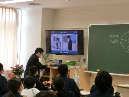5時間目の授業では片山先生と佐々木先生が出演した2本のモデリング動画を通して、挨拶や言葉遣いを学びました。モデリング動画については、生徒たちは何度も楽しみながら観ていました。