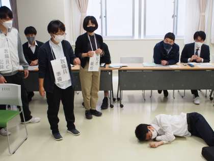 座学のあとは、実際にアレルギー対応が必要な生徒が出たことを想定した模擬訓練を行いました。練習用エピペンを使い、どのタイミングでどのような処置をしたら対応できるかの確認をしています。このあと、数多くの質問が出ていました。先生方の真剣度が伝わります。