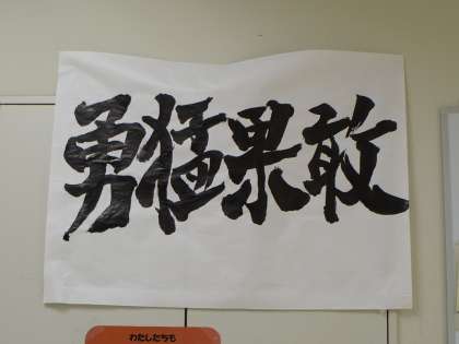週明けのフナキボの校舎からはどんよりした曇り空が見えます。でも、校内には曇り空をを吹き飛ばすような、元気な標語が掲げてあります。