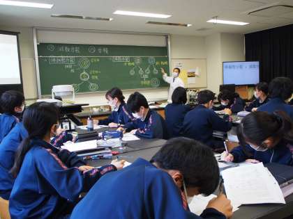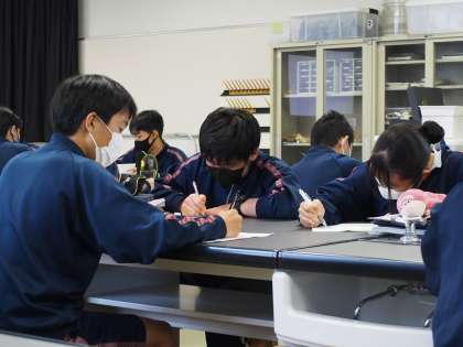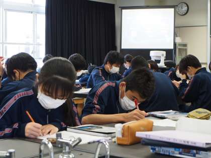 理科は細胞分裂について学んでいます。この時間は板書を中心にプリントにまとめる学習をしています。なので皆、真剣に下を向いています!