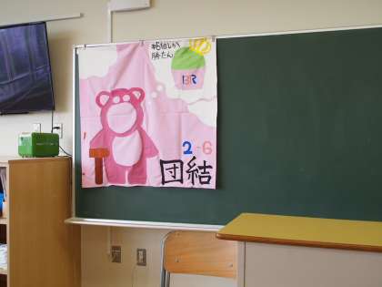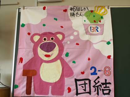運動会へ向けてクラス旗づくりが着々と進んでいます。昨日まで顔が未完成だった旗も、目と鼻と口が入ることで、俄然輝いてきました。
