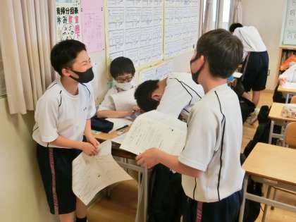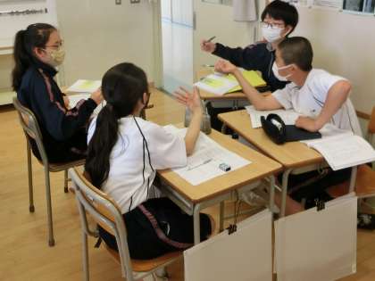 「質問する」(尋ねる)ことの意味を確認した後、質問を通して会話を発展させる練習をグループで行いました。グループで会話をつないでいくところは、どのクラスの生徒も楽しそうに行っていました。