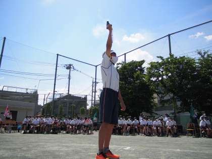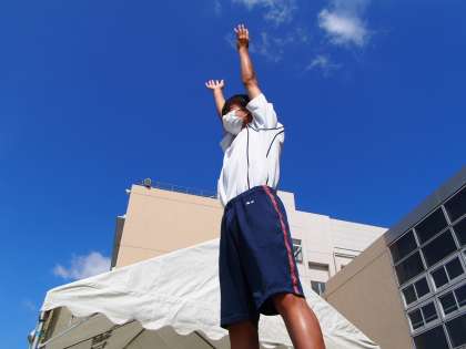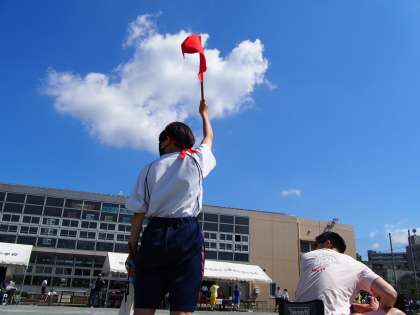 昨日はフナキボ生と職員、そして応援の保護者の方が一丸となって成功に導いた運動会でした。今日は成功のカギを握った係生徒の活躍を特集します。まずは青空に映える勇姿から。