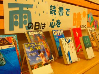 梅雨入りしたふなきぼの朝の風景。でも、図書室前には雨でも心が晴れる本がずらり。