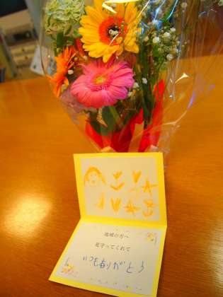 午前中に保育園児が届けてくれたプレゼントです。19世紀にアメリカの教会で始まった習慣で。6月第二日曜日の「花の日」で飾った花束を地域の病院・警察・学校などに届けてまわったのがルーツになっている活動とのこと。大切にします!