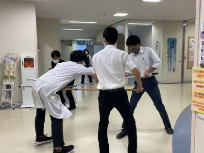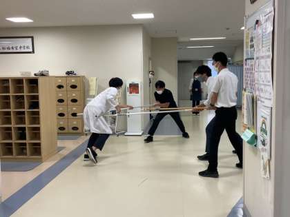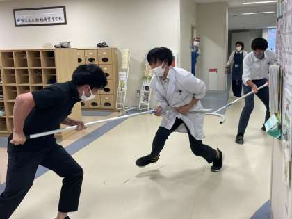 今日の避難訓練は不審者対応の設定で行われました。昇降口では、男性の先生方が不審者を前にさすまたやほうきを持って、実戦さながらの攻防が繰り広げられました。(大橋)